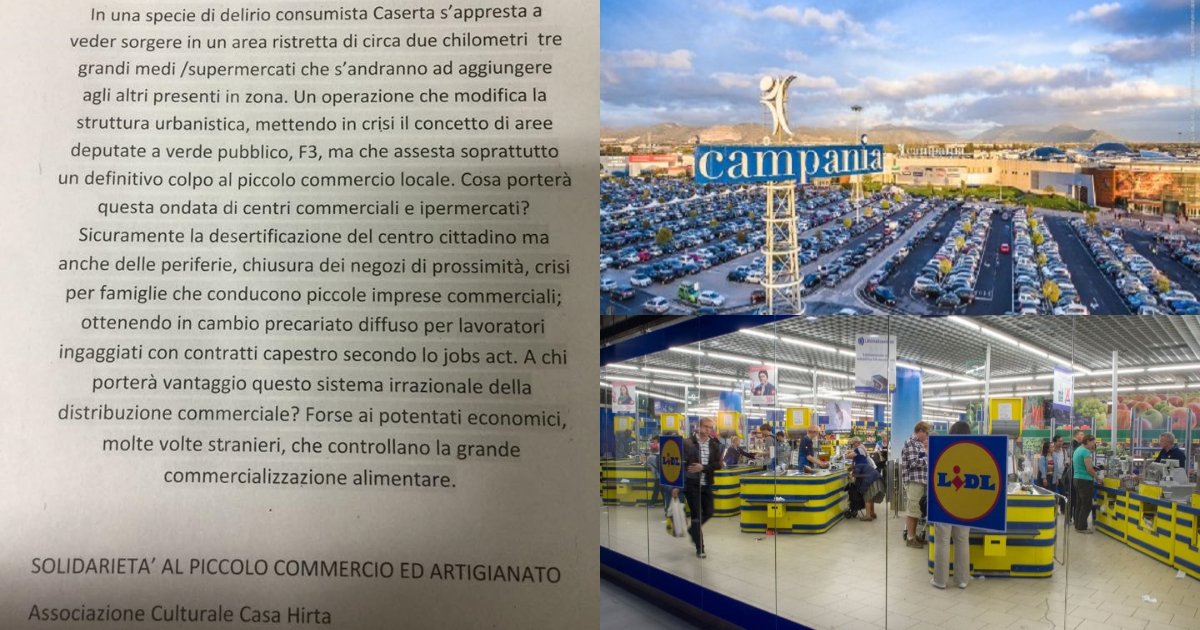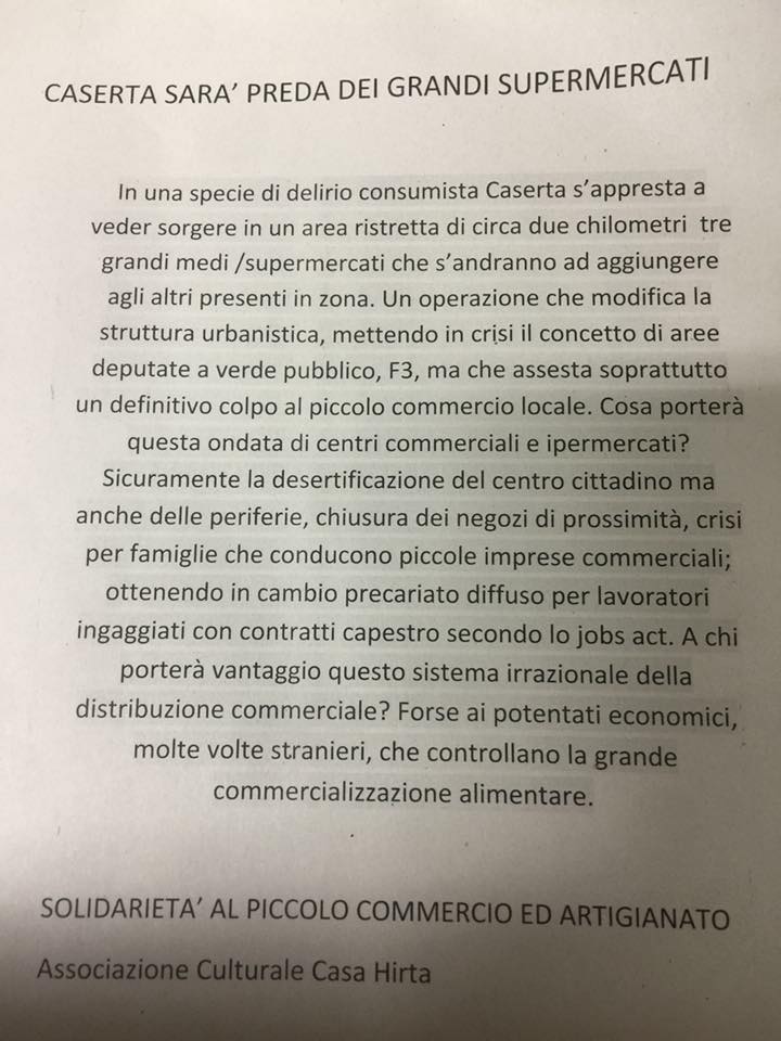 “In una specie di delirio consumista Caserta s’appresta a veder sorgere in un area ristretta di circa due chilometri tre grandi- medi supermercati – scrive l’Associazione – che s’andranno ad aggiungere agli altri presenti in zona. Un’operazione che modifica la struttura urbanistica, mettendo in crisi il concetto di aree deputate a verde pubblico, F3 ( area del piano regolatore del Comune di Caserta destinata al verde pubblico), ma che assesta soprattutto un definitivo colpo al piccolo commercio locale.”