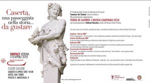 La quattro giorni di Vinitaly nell’area Caserta sarà caratterizzata da una serie di degustazioni: si partirà domenica 7 aprile, alle ore 13.30, con “Incontro con i Sapori del Territorio”, a cura dello chef Pietro Balletta che “racconterà” i prodotti tipici accompagnati dai vini casertani: il Falerno del Massico DOP; alle ore 16.30, “Vulcano, calcare, sabbie e fi¬umi: terre e vini della provincia di Caserta”, a cura del Consorzio di Tutela VITICA, con la sommelier Monica Coluccia, che illustrerà le sfumature e la forza varietale dei vitigni casertani nel corso di una degustazione guidata sui vini a Marchio.