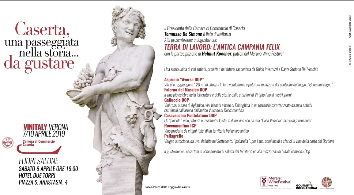Gli appuntamenti al Vinitaly saranno arricchiti anche “Fuori salone” con l’incontro previsto per sabato 6 aprile, alle ore 19, presso l’hotel Due Torri in piazza Sant’Anastasia, 4, a Verona. L’evento dal titolo “Terra di Lavoro: L’antica Campania Felix” vedrà la partecipazione di Helmut Koecher, patron del Merano Wine Festival. Una storia unica di vini antichi, proiettati nel futuro, raccontata da Guido Invernizzi e Dante Stefano Del Vecchio. In particolare il racconto dei vini riguarderà L’Asprinio “Aversa DOP”, viti che raggiungono i 20 metri di altezza e la loro vendemmia e potatura è realizzata dai contadini del luogo, i cosiddetti “uomini ragno”; Il Falerno del Massico DOP, il vino più celebre della letteratura e della storia: dalle citazioni di Virgilio fino ai nostri giorni; Galluccio DOP, vini rossi a base di Aglianico, vini bianchi a base di Falanghina in un territorio caratterizzato da suoli antichi resi fertili dall’azione dell’antico vulcano di Roccamonfina; Casavecchia Pontelatone DOP, la storia di un vino potente e resistente che da una “Casa Vecchia” arriva ai giorni nostri; Roccamonfina IGP, vino prodotto da vitigni tipici di un territorio vulcanico antico e Pallagrello, vitigno autoctono, da uva, definita nel Settecento, “pallarella”, per i suoi acini lucidi e sferici, il vino della corte dei Borbone.