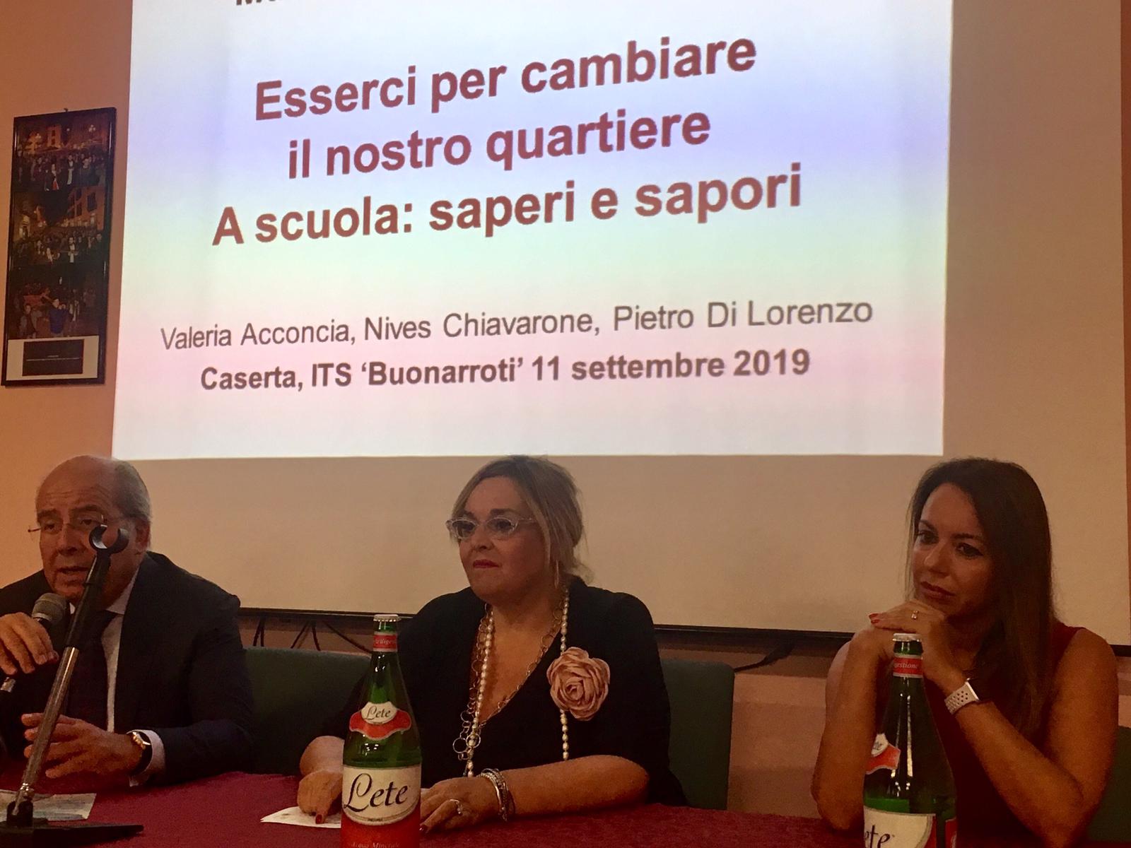 Fermento e grande entusiasmo si nel percepivano di oggi nell’aula Magna dell’ I.T.S. ” M. Buonarroti” guidato da qualche anno dalla instancabile e vulcanica Dirigente Vittoria De Lucia“. Alle ore 17,00 alla presenza delle istituzioni e dei partner è stato presentato “Esserci per cambiare il nostro quartiere. A scuola: saperi e sapori” , un progetto innovativo che ha come obiettivo primario l’integrazione reale e concreta tra scuola e quartiere, attraverso una serie di percorsi ed attività completamente gratuiti, rivolti in primis agli abitanti di questa area di Caserta, prettamente popolare, in cui insiste l’istituto, ma non solo. Da sottolinerare che solo 71 scuole sono state selezionate per questa importante ed impegnativa sfida.