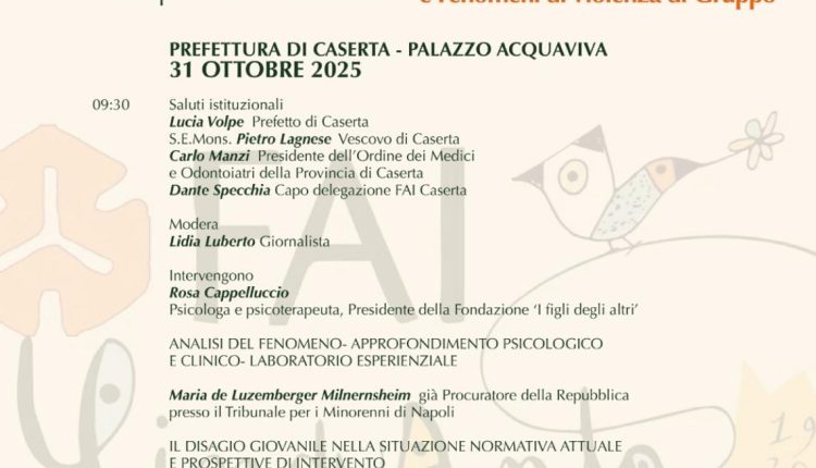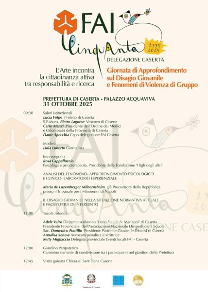 Caserta – Il 31 ottobre 2025, nella splendida cornice della Prefettura di Caserta – Palazzo Acquaviva, si terrà la Giornata di approfondimento sul disagio giovanile e i fenomeni di violenza di gruppo, promossa dalla Delegazione FAI di Caserta nell’ambito delle celebrazioni per i cinquant’anni del Fondo per l’Ambiente Italiano.