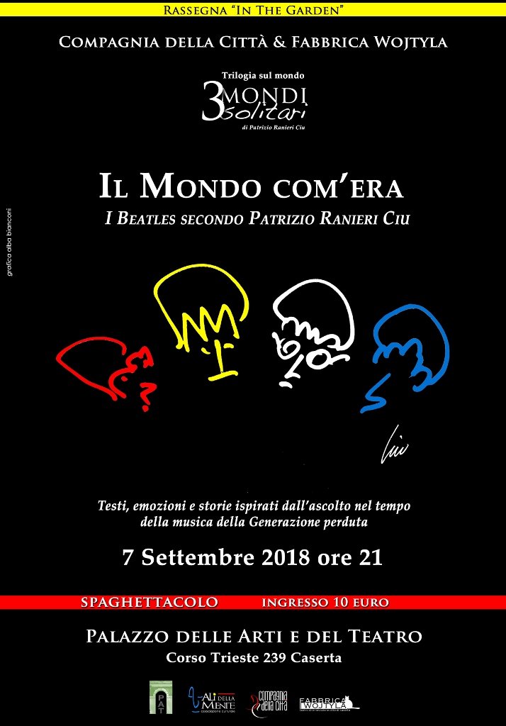 CASERTA – I Beatles come non li avete mai vissuti, il 7 settembre 2018, con inizio alle ore 21.00 nel giardino del PAT, Palazzo Arti e Teatro di Corso Trieste n.239. Il fenomeno Beatles ha contrassegnato il linguaggio di una gioventù che scopriva la libertà come condizione essenziale di vita. Nell’arco di pochi anni rivoluzioni esistenziali hanno abbattuto barriere millenarie di regole rigide e bigotte cambiando il modo di essere e di pensare. Patrizio Ranieri Ciu è un protagonista di quella esperienza e testimone tra i più attendibili grazie alla sua libera poetica che nel Teatro è divenuta cifra e stile inconfondibile con i Monodialoghi. Il Mondo com’era, proposto in anteprima al PAT, è un tracciato di questa esperienza intellettuale che gli attori della Compagnia della Città & Fabbrica Wojtyla fanno propria con una sensibilità che non ha eguali. I testi dello spettacolo, diretta ispirazione delle musiche geniali dei 4 di Liverpool, sono il percorso sensoriale tra speranza, sentimento e disillusione nel simbolico arco di tempo tra il colpo di fucile di Dallas e quello di pistola sulle scale di ingresso del Dakota Building. La generazione perduta si guarda finalmente allo specchio. L’originale e consueto spaghetto finale in compagnia degli attori e dell’autore vi attende per commentare insieme una epoca indimenticabile. Per info & prenotazioni 392.2954745 – 334.1281015 – 393.3746011