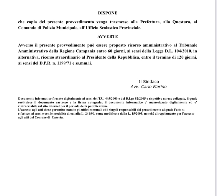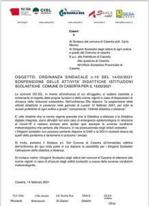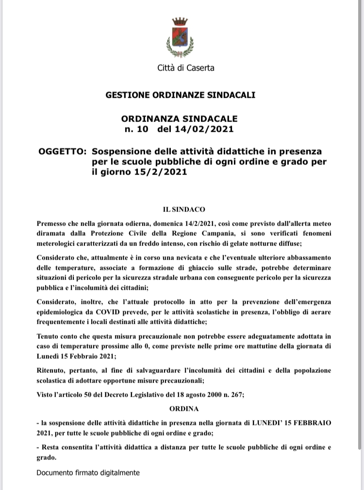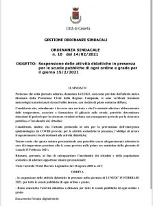 Caserta– Il sindaco Marino, considerata l’allearta meteo dispone la chiusura delle scuole di ogni ordine e grado e al contempo sottolinea che resta consentita la DAD