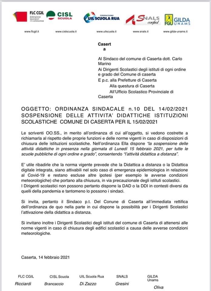 Subito i sindacati hanno contestato al sindaco la violazione delle norme vigenti, poiché oltre alla chiusura delle scuole ha previsto l’attivazione della didattica a distanza. In questo senso il sindaco, nel dare indicazioni sulle attività da svolgere, si sarebbe attribuito funzioni che non gli competono.