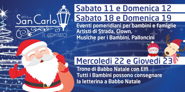 Caserta. Tutto pronto in Via San Carlo dove fra poco ( alle 18 circa) un gruppo di animatori allieterà la serata ai bambini con artisti di strada , Clown , musica e palloncini . Quella di stasera è la prima di numerose iniziative che ogni fine settimana il comitato ” Antica Via San Carlo” ha organizzato per tutto il mese di Dicembre.
