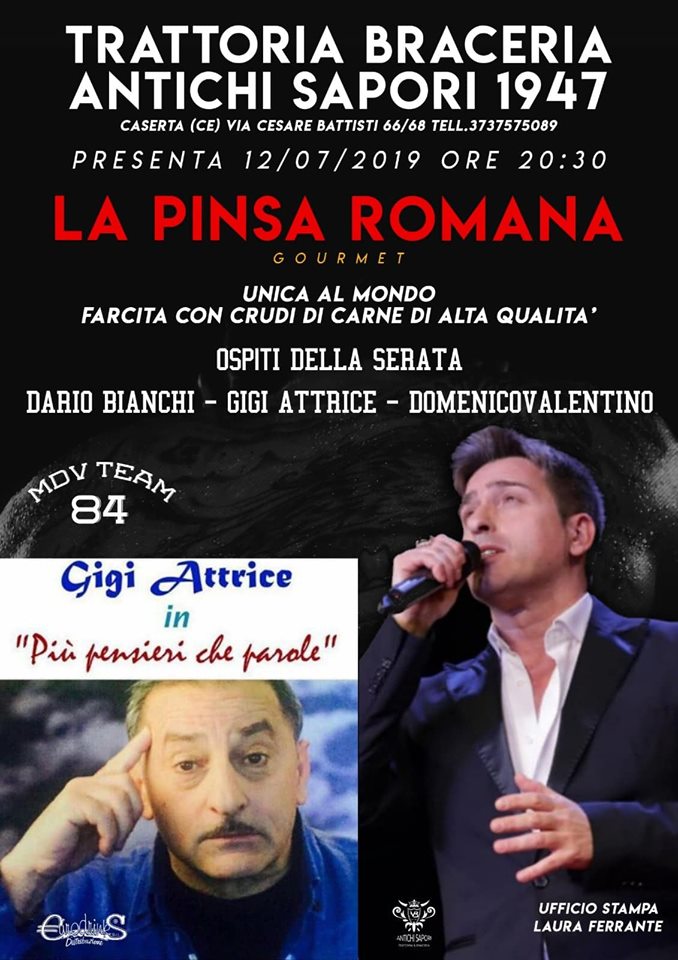 Caserta – Alla Trattoria Braceria Antichi Sapori di Vincenzo Barbato, in via Cesare Battisti a Caserta, venerdì 12 luglio 2019, alle 20.30 ci sarà un inocntro gastronomico, con la ‘festa’ della Pinsa romana e presentazione di Pinsa con crudi di carne chiamata Pinsa dei campioni, dedicata al campione del mondo di pugilato Domenico Valentino. Una novità assoluta in campo gastronomico. La serata sarà allietata ed accompaganta da musica e assaggi di pinsa.