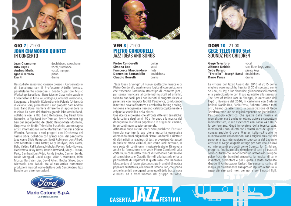Il Caserta Jazz Festival si terrà a P.zza Matteotti nei giorni 7,8,10 e 11 settembre, inizio concerti ore 21.00, ma dalle ore 20.00 sarà possibile partecipare all’Aperjazz compreso nel costo del biglietto.