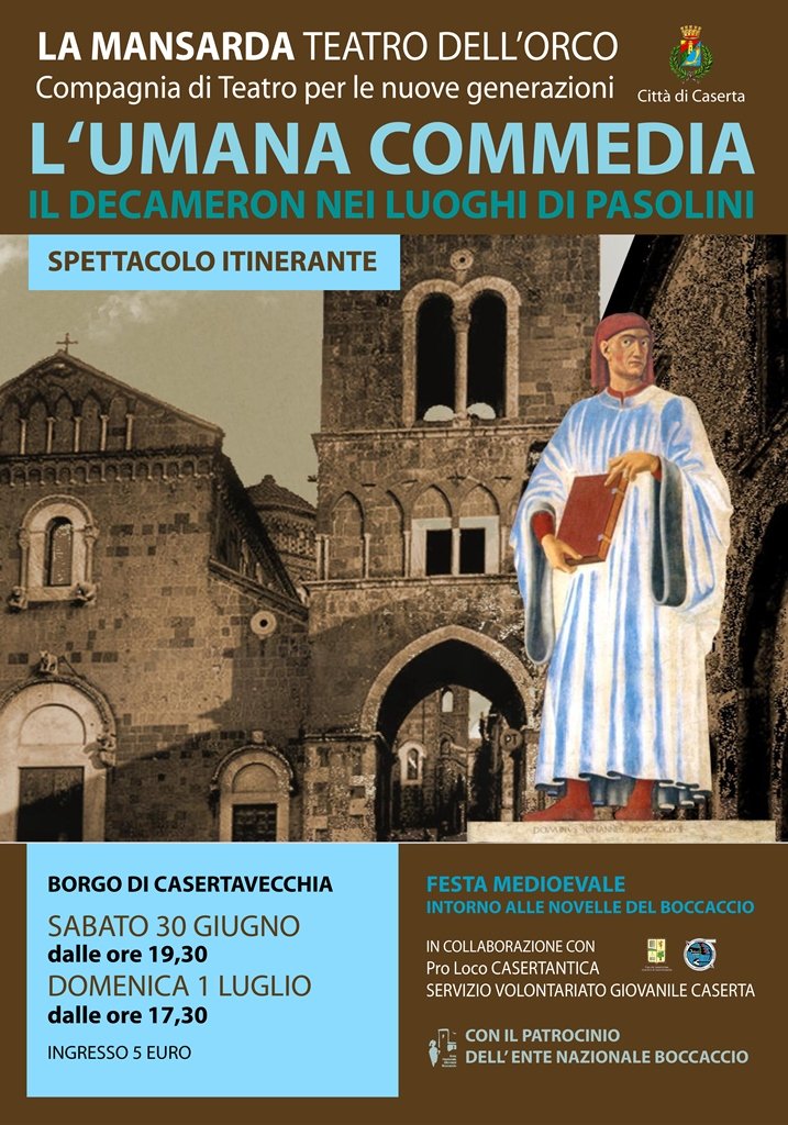 CASERTA – Nello splendido Borgo di Casertavecchia prende vita una Festa Medievale, allietata dalla musica e dall’allegria contagiosa di un gruppo di musici e giullari che farà da cornice alla rappresentazione teatrale itinerante di alcune tra le più belle novelle di Giovanni Boccaccio, ambientate in alcuni angoli suggestivi tutti da scoprire. La Compagnia La Mansarda Teatro dell’Orco, direzione artistica Roberta Sandias, presenta, sabato 30 giugno 2018, ore 19.30, e domenica 1 luglio 2018, ore 17.30, nel Borgo di Casertavecchia, lo spettacolo itinerante “L’Umana Commedia – Il Decameron nei luoghi di Pasolini”