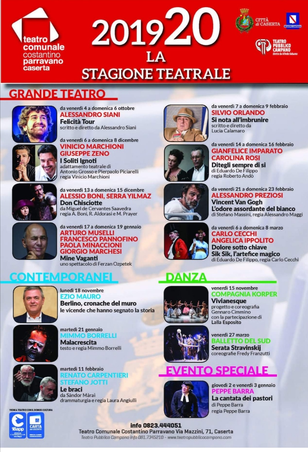 Aprirà, il 4 ottobre, il grande Alessandro Siani, con lo spettacolo dal titolo invitante “Felicità tour”. A seguire altri nomi di rilevanza internazionale come Alessandro Preziosi e l’ immenso Peppe Barra.