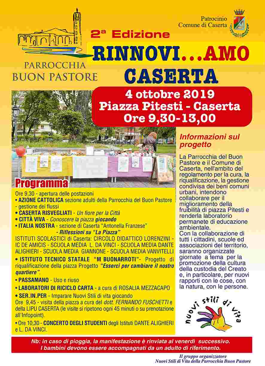 CASERTA – Si terrà venerdì 4 ottobre, dalle ore 9:30 alle ore 13, in Piazza Pitesti, la manifestazione “Rinnovi…AMO Caserta”, giunta alla sua seconda edizione. La Parrocchia del Buon Pastore, di cui è parroco don Antonello Giannotti, e il Comune di Caserta, nell’ambito del regolamento per la cura, la riqualificazione, la gestione condivisa dei beni comuni urbani, intendono collaborare per migliorare la fruibilità di Piazza Pitesti e renderla al contempo laboratorio permanente di educazione ambientale.