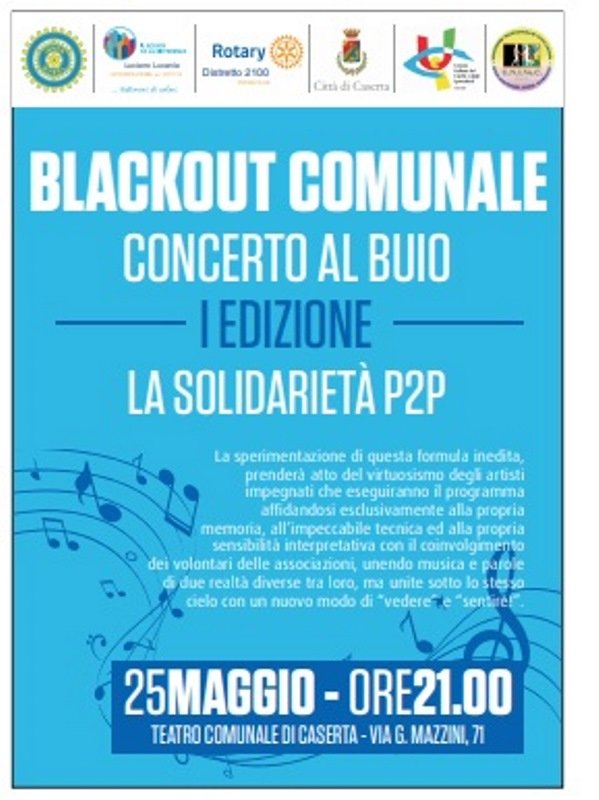 CASERTA – I Rotary Club Caserta Luigi Vanvitelli – Caserta Reggia e Sessa Aurunca, insieme ai Club Inner Wheel Caserta Luigi Vanvitelli ed Ercolano Ville Vesuviane, in collaborazione con l’Unione Italiana dei Ciechi e degli Ipovedenti (U.I.C.I.) e l’Unione Nazionale Italiana Volontari Pro Ciechi (U.N.I.Vo.C.) di Caserta, enti del terzo settore ETS, organizzano la prima edizione del “Concerto al Buio, la solidarietà peer to peer” per venerdì 25 maggio 2018, con inizio alle ore 21.00, al teatro Comunale di Caserta, via G. Mazzini 71. Nell’era in cui le immagini la fanno da padrone, immagini che spesso comunicano solo a gesti, creando distrazioni che celano problematiche di disagio sociale e che subiscono le fasce deboli della società, i Rotary Club Caserta Luigi Vanvitelli – Caserta Reggia e Sessa Aurunca ed i Club Inner Wheel Caserta Luigi Vanvitelli e Ercolano Ville Vesuviane, organizzatori di questo viaggio della solidarietà, condividendo a pieno le finalità delle su indicate associazioni, sosterranno l’evento a 360°, in un trasferimento “peer to peer” di conoscenze e competenze, promuovendo “la diffusione di quei valori umani che fanno la differenza”, proponendo ed attuando soluzioni efficaci e durature, contro ogni forma di discriminazione. Questa innovativa proposta di coinvolgere i partecipanti, attraverso una nuova modalità percettiva, valorizza l’interiorizzazione dell’ascolto musicale, realizzando in ciascuno un significativo momento di forte crescita personale e culturale. Al buio, cadono le barriere, si perde la cognizione del tempo. Il buio sarà strumento coinvolgente per i partecipanti, ai quali sarà data possibilità di immedesimarsi nella vita quotidiana di chi è privo della vista, mentre gli operatori presenti in sala (non vedenti), che svolgeranno servizio di assistenza, costituiranno un punto di riferimento e di aiuto per i partecipanti. Il concerto verrà eseguito dal rinomato violinista e compositore Alfredo Notarloberti, il quale insieme alla sua band suuoberanno nell’oscurità, senza il supporto di spartiti e di direttive gestuali. In sala saranno vietati cellulari, accendini e qualunque forma di luce che potrebbe disturbare l’evento. L’offuscamento delle fonti luminose, eseguito dai volontari, non è un lavoro semplice; gli artisti stessi hanno accettato di mettersi alla prova, ragion per cui si prega di avere rispetto di detta regola. Considerata la complessità dell’evento, le persone interessate alla Kermesse sono pregate di prenotarsi tempestivamente e di presentarsi puntuali all’appuntamento, entro le 21, poiché, una volta spente le luci, non sarà più possibile entrare in sala. L’evento ha anche la finalità di raccogliere fondi per contribuire all’acquisto di bastoni bianchi per l’orientamento e la mobilità.