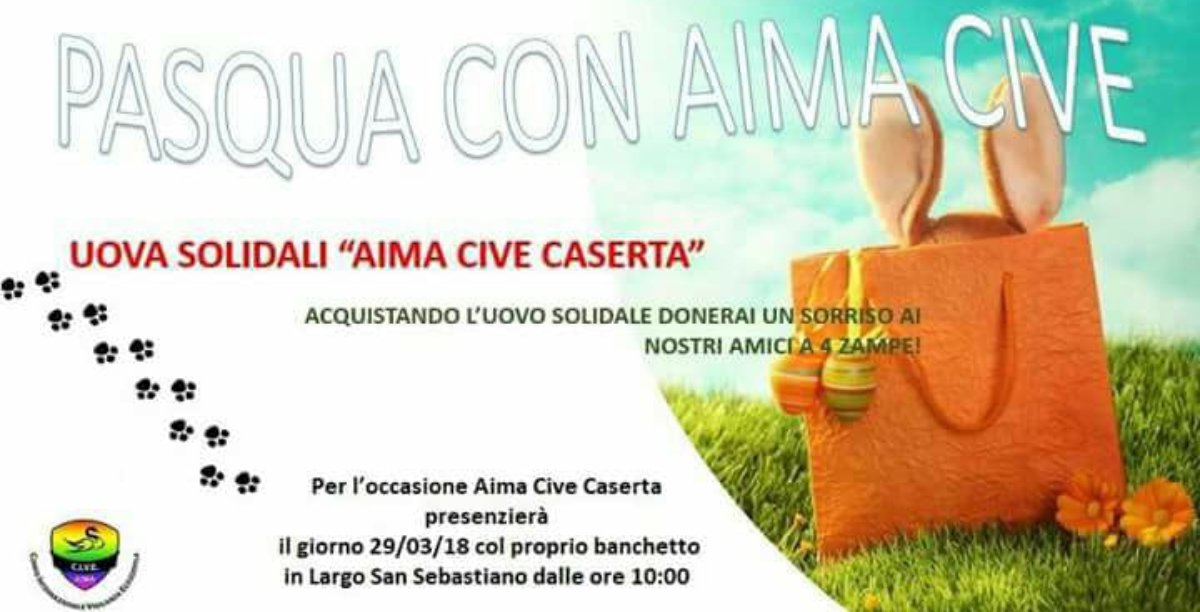 CASERTA – A.I.M.A. C.I.V.E. delegazione Caserta, vi aspetta in Largo S.Sebastiano, via Mazzini- Caserta, giovedì 29 marzo 2018 con lo stand delle uova solidali e gadget. L’associazione A.I.M.A. C.I.V.E. si occupa di vigilanza zoofila ed ambientale e di Protezione Civile. La delegazione di Caserta, si prende cura ed assiste con infinita dedizione, gli animali randagi e quelli in difficoltà. Gli animali, che vengono presi in carico, vengono curati, sterilizzati e fatti adottare. Un vostro piccolo gesto di generosità, può fare la differenza, nel sostenere il già difficile operato delle volontarie, che si adoperano con enormi sacrifici, nella fattispecie economici. Aprite i vostri cuori, un piccolo contributo, donato con amore, può cambiare il destino di un randagio!