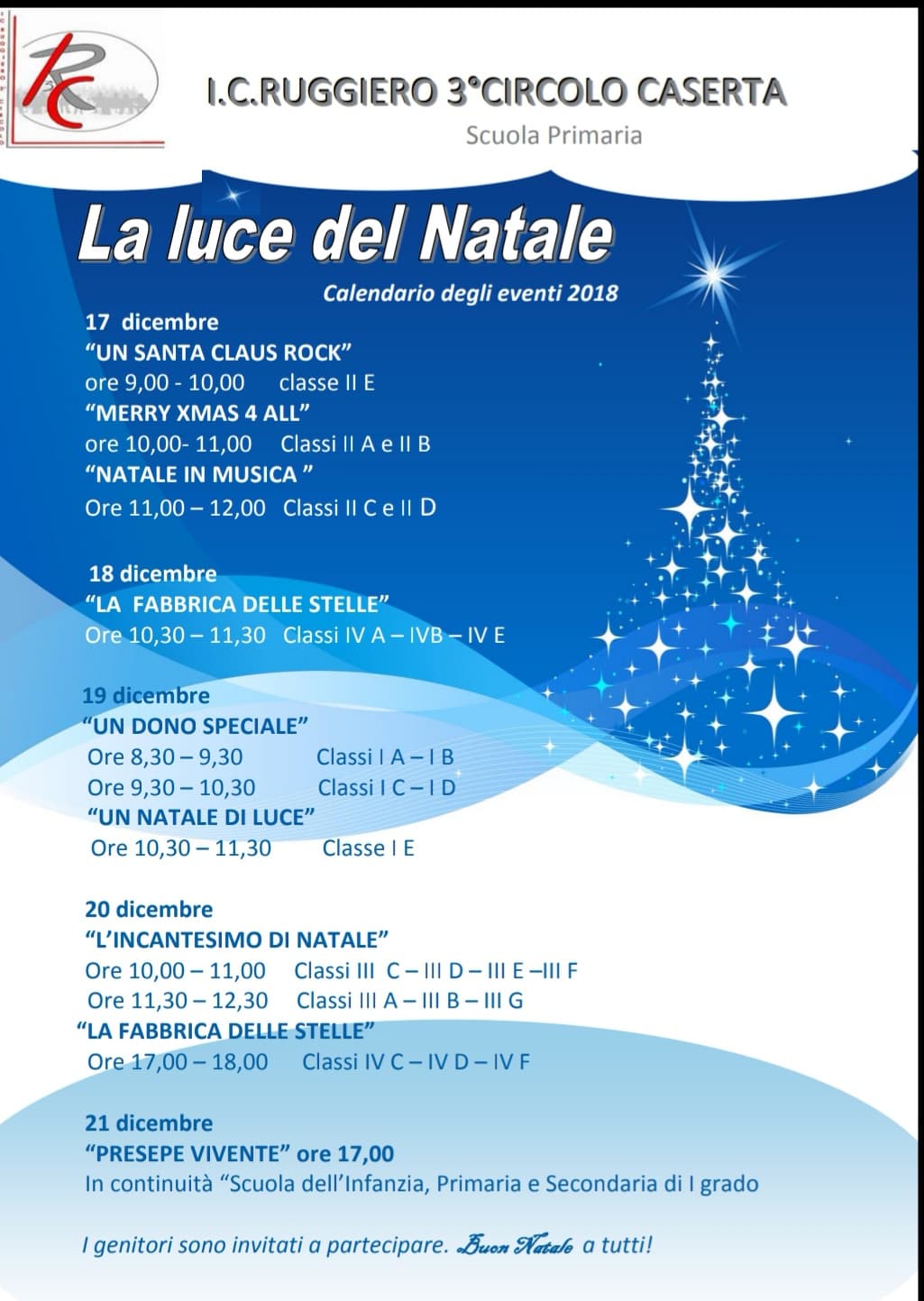 CASERTA – Anche quest’anno l’Istituto Comprensivo “Ruggiero – 3° Circolo” di Caserta ha organizzato il calendario 2018 delle attività in vista delle oramai prossime festività natalizie dal titolo: “La luce del Natale”. L’obiettivo dell’istituto è quello di riscoprire e far scoprire ai nostri bambini il vero spirito del Natale. Le giornate organizzate grazie al personale docente vogliono essere oltre che un momento di festa e di divertimento per grandi e piccini, uno spazio dove ricordare chi sta attraversando un periodo difficile. Il Natale, che viene spesso idolatrato per i doni, gli addobbi, i cenoni e i dolci, deve aiutare tutti, grandi e piccini, a riscoprire alcuni valori come l’amore e la solidarietà, troppo spesso messi da parte nella quotidianità per fare spazio a frenesia, egoismo e avidità. Inoltre si è pensato di fare un regalo di Natale ai bambini meno fortunati della zona.