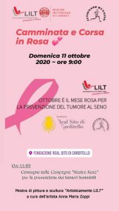 Questa edizione, la manifestazione in rosa, assume un particolare significato perché vuole recuperare il tempo perduto, a causa della pandemia Covid che ha visto trascurata la problematica sanitaria – oncologica e in particolare la prevenzione. La sezione LITL provinciale di Caserta presieduta dalla dottoressa Angela Maffeo oltre la parte sportiva annunciata, (con inizio alle ore nove) la curata brochure mette in evidenza una mostra di pittura e scultura denominata “Artisticamente Lilt” allestita dell’artista Anna Maria Zoppi e del convegno che si terrà alle ore 11:00 con medici e operatori del settore argomento dell’incontro precedere i tumori che mettono a rischio la vita della donna; parteciperà il presidente nazionale LITL Francesco Schittulli. La parte sportiva, curata dalla società sportiva Alvignano Running, ovviamente non è una gara, ma è solo una manifestazione a supporto della predetta “Campagna Nastro Rosa”, ed è assolutamente gratuita; quindi possono partecipare tutti, parenti, amici e conoscenti. Si può correre e/o passeggiare, ma addirittura si può anche solo partecipare visitando il sito museale della Reggia di Carditello complesso architettonico sobrio ed elegante ricco d’interesse a presentarla la beniamina dei podisti Zagara Arancio.