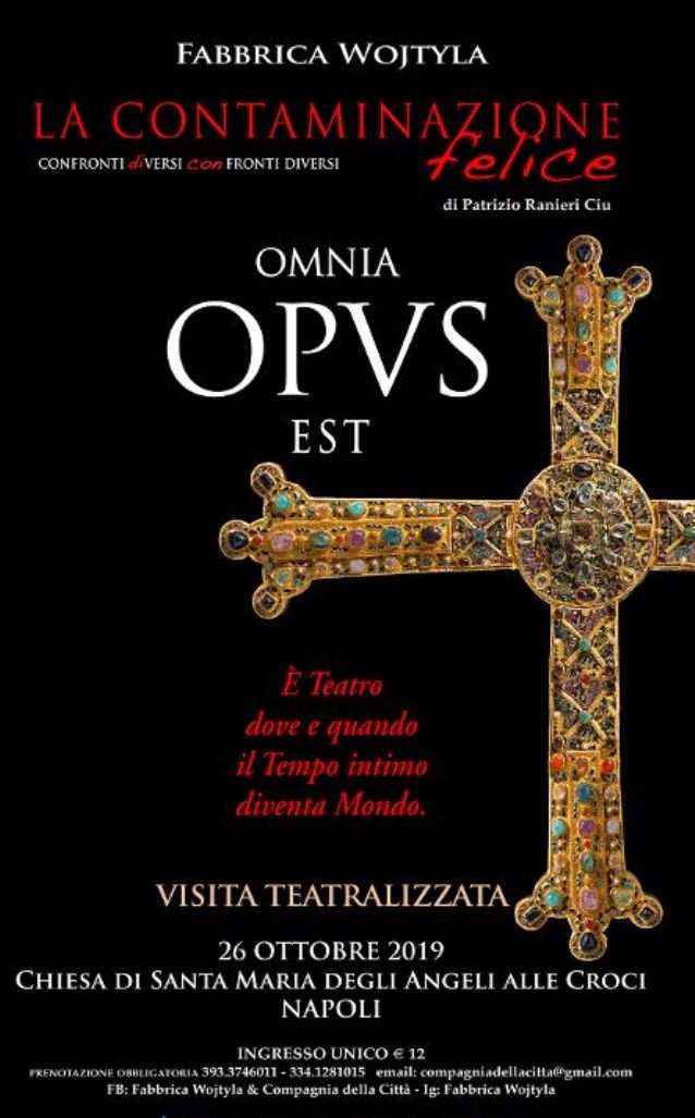 CASERTA – Sabato 26 Ottobre la Compagnia della Città & Fabbrica Wojtyla mette in scena “OPVS” – La Contaminazione Felice, visita e teatro d’autore nello splendore artistico della maestosa chiesa di S. Maria degli Angeli alle Croci. Una produzione Ali della Mente in collaborazione con Reggia Travel e le Guide Regionali.