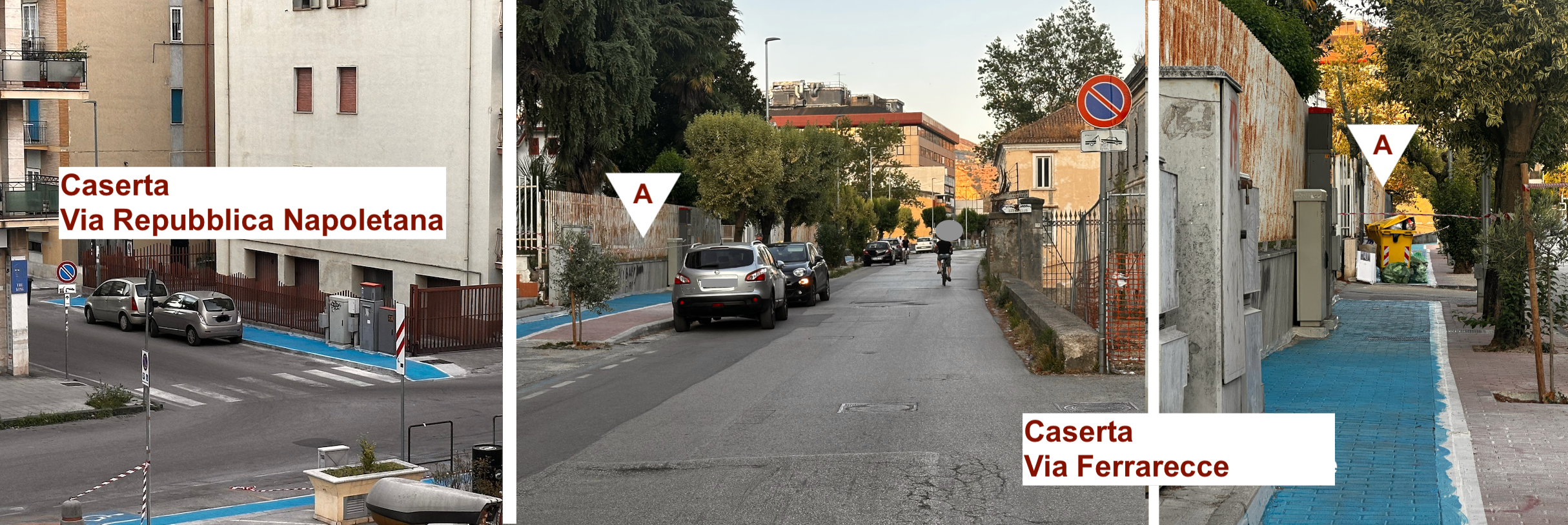 CASERTA In via Repubblica Napoletana e in via Ferrarecce alcuni marciapiedi sono stati interamente pitturati d’azzurro. Non risultano installati cartelli verticali, non si rilevano delimitazioni orizzontali conformi, e non è stata fornita alcuna informazione pubblica sul cambiamento della destinazione d’uso di questi spazi. La funzione pedonale risulta di fatto annullata, in assenza di alternative sicure.