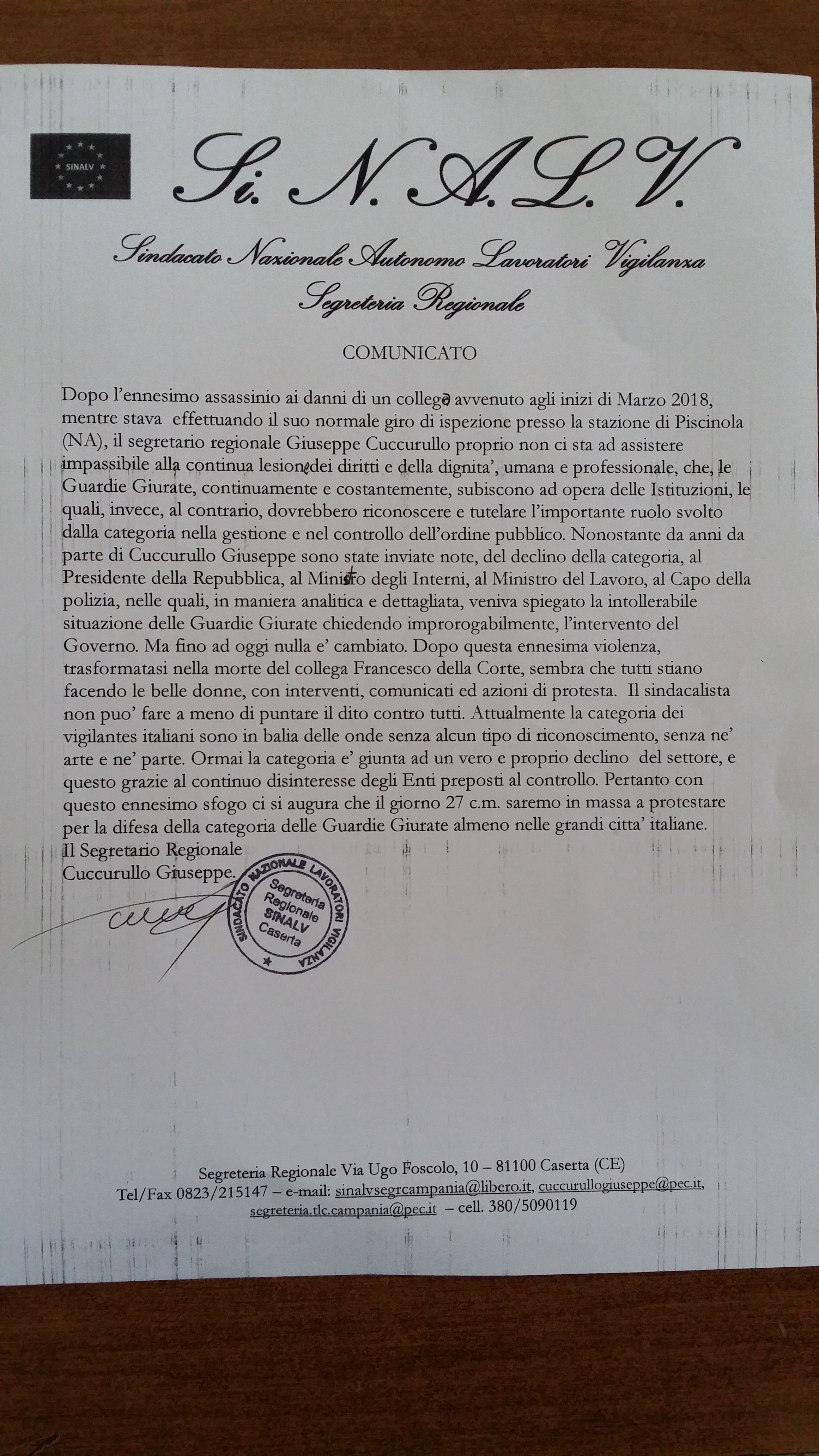 CASERTA. Morte di Franco Della Corte . Il Segretario Regionale del Sindacato Si.N.A.L.V. – Sindacato Nazionale Autonomo Lavoratori Vigilanza – , Giuseppe Cuccurullo , nel ricordare la tragedia di cui e’ stata vittima la Guardia Giurata di Marano, non puo’ non puntare il dito contro le Istituzioni che ” fino ad oggi non hanno mai recepito le istanze e le necessita’ della categoria delle Guardie Giurate “. Giuseppe Cuccurullo , altresi’, conferma la partecipazione dello Si.N.A.L.V. alla manifestazione che si terra’ il 27 marzo 2018 in tutte le grandi citta’ italiane a difesa della categoria delle Guardie Giurate.