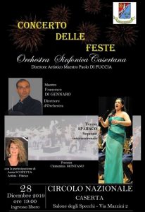 Il percorso musicale della Signora della lirica, il Soprano Sparaco, continua anche nel periodo delle feste natalizie con due concerti. Il 28 dicembre 2019, alle ore 19:00, presso lo storico Circolo Nazionale di Caserta, con ingresso in Via Mazzini 2, si esibirà nel Salone degli Specchi con l’Orchestra Sinfonica Casertana diretta dal Maestro Francesco Di Gennaro. Direttore Artistico è M° Paolo Di Fuccia, coordinatore musicale M° Luciana Cenname. Presenta la serata la Prof.ssa Clementina Montano. Oltre alla musica la serata ha anche uno spazio artistico pittorico con l’esposizione delle opere pittoriche di Anna Scopetta.