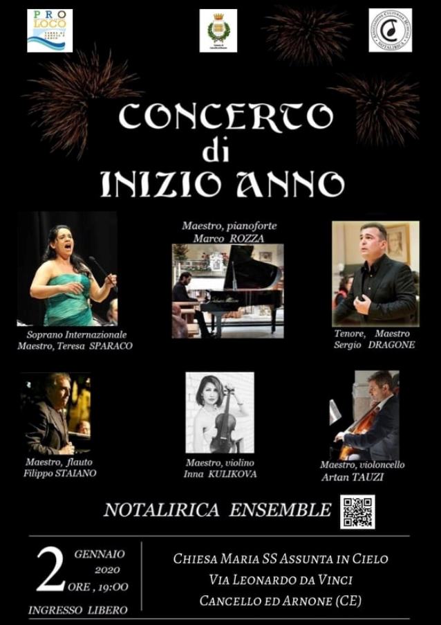 La Sparaco inizia il 2020 con il “Concerto di Inizio Anno” in Cancello ed Arnone presso la Chiesa Maria SS Assunta in Cielo, ore 19:00. Con il suo Notalirica Ensemble si esibirà il Tenore M° Sergio Dragone, M° Marco Rozza, pianista; M° Filippo Staiano, flauto; M° Inna Kulikova, violino; M° Artan Tauzi, violoncello. Tutti i concerti sono a ingresso gratuito.