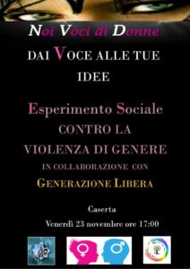 L’associazione, attiva dal 2008 sul territorio casertano, presenterà le sue attività, con il convegno iniziale, lunedì 19 novembre 2018 al chiostro di Sant’Agostino in Caserta. In questa occasione saranno letti dei brevi passi tratti da storie delle utenti, opportunamente modificate e romanzate. A seguire ci sarà lo spettacolo teatrale dell’associazione Generazione Libera.