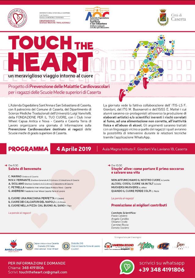 “Touch the Heart” è il titolo della manifestazione organizzata dall’Azienda Ospedaliera di Caserta “Sant’Anna e San Sebastiano” per giovedì 4 aprile 2019. L’appuntamento è alle 9,30 presso l’Aula Magna dell’Istituto Giordani di Caserta in via Laviano.