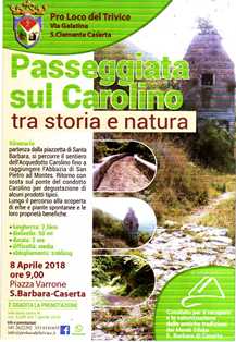 Passeggiata sul Carolino tra storia e natura domenica 8 aprile con partenza alle ore 9 dalla piazzetta Varrone di S. Barbara di Caserta. Si percorre il sentiero dell’Acquedotto Carolino fino a raggiungere l’Abbazia di S. Pietro ad Montes. Ritorno con sosta sul ponte del condotto Carolino per degustazione di alcuni prodotti tipici. Lungo il percorso alla scoperta di erbe e piante spontanee e le loro proprietà benefiche. Lunghezza del percorso: 2,5 Km.; dislivello: 50 m.; durata: 2 ore; difficoltà. media; abbigliamento: trekking. E’ gradita la prenotazione.
