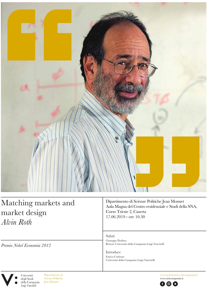CASERTA – Alvin Roth – Premio Nobel per l’economia 2012 – all’Università Vanvitelli con una conferenza dal titolo “Matching markets and market design”. L’evento, organizzato dal Dipartimento di Scienze politiche dell’Ateneo, si terrà il 17 giugno presso l’Aula Magna del Centro residenziale e studi della SNA, Corso Trieste a Caserta alle ore 10:30. Presente, per i saluti, il Rettore dell’Università degli Studi della Campania “L. Vanvitelli” Giuseppe Paolisso. Ad introdurre i lavori sarà la Prof.ssa Enrica Carbone. Sarà presente all’incontro altresì don Antonello Giannotti.