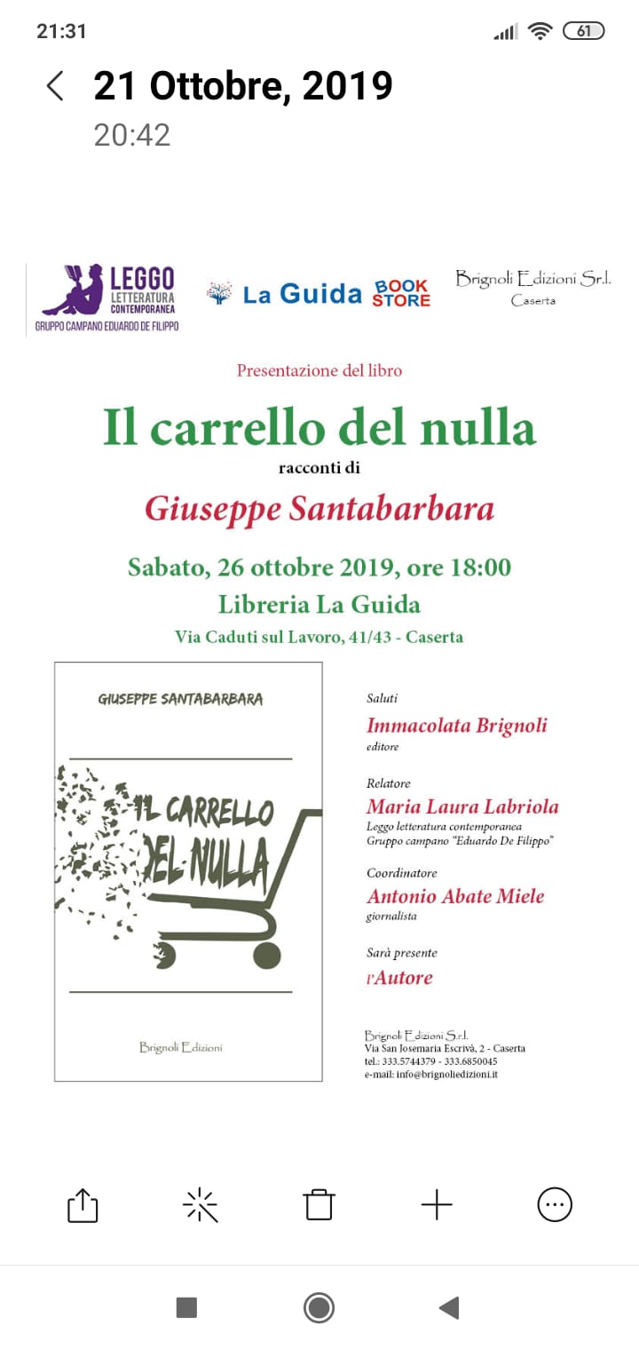 Sabato 26 ottobre 2019, alle ore 18, presso la libreria “La Guida” di via Caduti sul Lavoro – Caserta, sarà presentato il  libro “Il carrello del nulla” del noto scrittore “Giuseppe Santabarbara”, edito da Brignoli Edizioni Caserta.