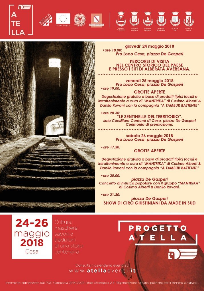 CASERTA – Progetto “Atella”: anche il prossimo fine settimana tornano gli eventi nell’ambito della rassegna cofinanziata dal Poc Campania 2014-2020, che vede coinvolti i Comuni di Frattaminore, Sant’Arpino, Gricignano d’Aversa, Orta di Atella, Succivo e Cesa. Proprio a Cesa, a partire da giovedì 24 maggio 2018, ci saranno una serie di iniziative culturali e spettacoli di musica popolare e di cabaret. La Pro loco di Cesa, giovedì dalle ore 18.00, organizza i percorsi di visita nel centro storico del paese e presso i siti dell’Alberata Aversana. Venerdì, sempre i rappresentanti della Pro loco locale daranno vita all’evento “Grotte aperte”