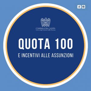 CASERTA – Una giornata informativa su due temi di grande attualità e di sicuro interesse quali la cosiddetta “Quota 100” e gli incentivi alle assunzioni è stata organizzata da Confindustria Caserta per lunedì 1 aprile 2019, con la partecipazione di esperti di Confindustria Nazionale e dell’Inps. Il Decreto Legge 28 gennaio 2019 numero 4, divenuto legge dello Stato dopo l’approvazione definitiva in Senato, recante disposizioni urgenti in materia di reddito di cittadinanza e di pensioni, ha introdotto la cosiddetta “Quota 100” e altre modifiche al regime pensionistico.