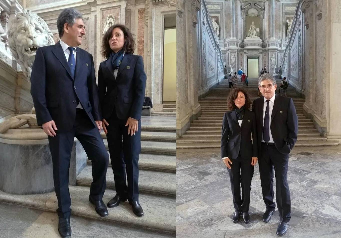 CASERTA – Stamattina, venerdì 29 giugno 2018, avevamo dato la notizia che da domenica 1 luglio 2018 il personale di accoglienza e vigilanza della Reggia di Caserta avrebbe indossato in servizio le nuove divise. Ora possiamo pubblicare le foto delle nuove divise indossate per l’occasione dai sigg. Lorena Di Gaetano ed Enzo Toscano. Le divise, come si può vedere dalle foto sono molto eleganti ed hanno già incontrato l’apprezzamento sul web di moltissimi utenti. Ci associamo a loro e esprimiamo le nostre congratulazioni al direttore generale per l’ottima idea. Le nuove divise sono state fornite dalla ditta FORINT Forniture Industriali Tessili SpA, vincitrice della fornitura, che ha realizzato per il personale di accoglienza e vigilanza del Complesso Vanvitelliano le divise estive e invernali di colore blu. L’equipaggiamento maschile comprende un abito con giacca, pantalone, camicia, cravatta, calzature e soprabito per l’inverno; per l’estate la dotazione è costituita da pantalone, camicia, polo, giubbotto e calzature. La divisa femminile comprende invece un tailleur con giacca, gonna, pantalone, camicia, pullover, calzature e foulard per l’inverno, e per l’estate gonna, pantalone, camicia, polo, giubbotto e calzature. Tutti i capi sono griffati con il logo stilizzato della Reggia.