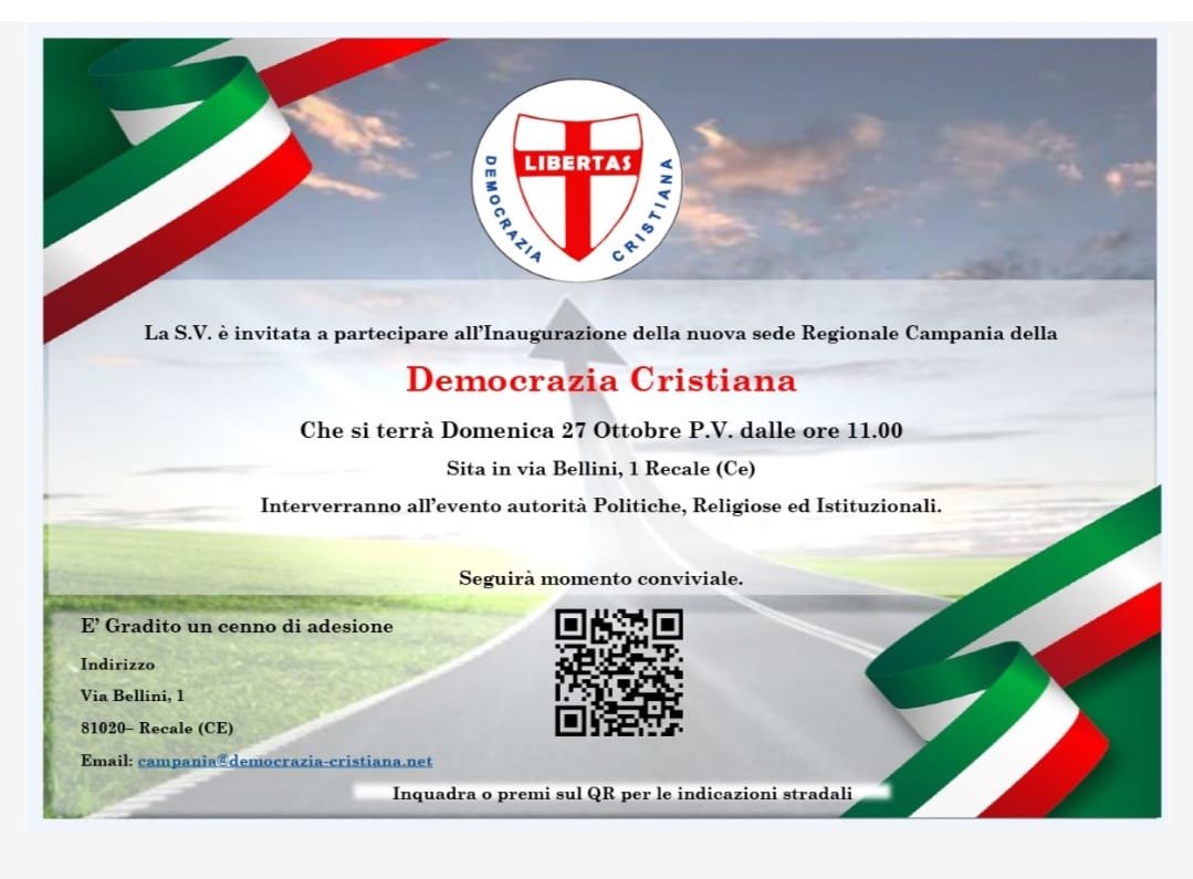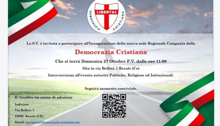 Caserta. La Democrazia Cristiana riparte da Recale, domenica 27 ottobre ore 11:00 in via Bellini 1, grazie ad un incontro con la cittadinanza che segnerà l’inizio di un nuovo percorso per il partito, tracciato già mesi fa dall’inaugurazione del mandato del neo eletto Segretario Regionale, Avv. Valerio Stravino.