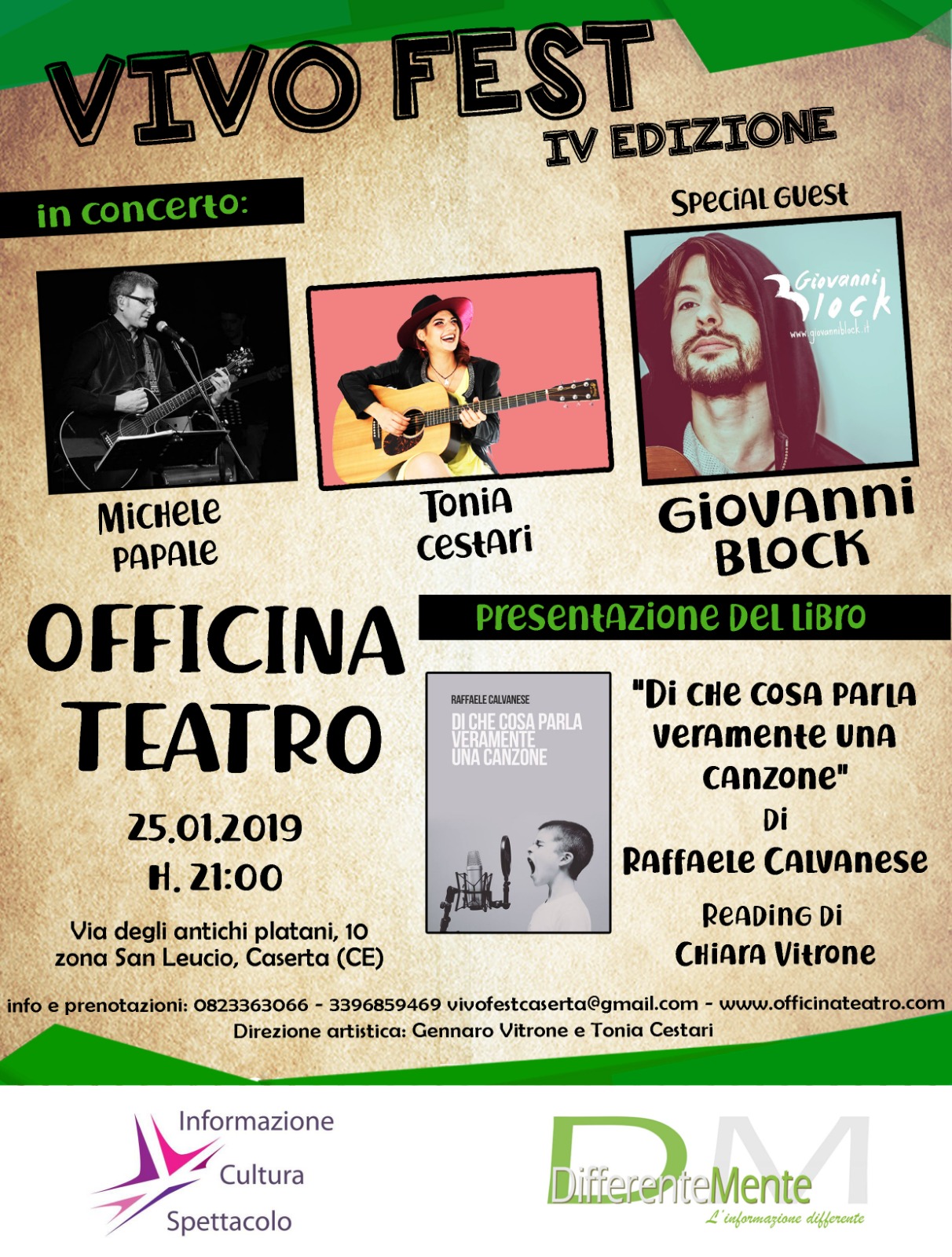 Caserta. Secondo incontro con la musica d’autore al Vivo Fest, la rassegna dedicata alla musica italiana che attraversa immagini e note realizzate da importanti artisti campani. Venerdì 25 gennaio 2019 dalle ore 21,00, Officina Teatro, in via Degli Antichi Platani 30 a San Leucio, accoglie il progetto nato da un idea di Gennaro Vitrone, un format che si conferma per la 4a edizione con la direzione artistica dello stesso Vitrone insieme alla cantante casertana Tonia Cestari.