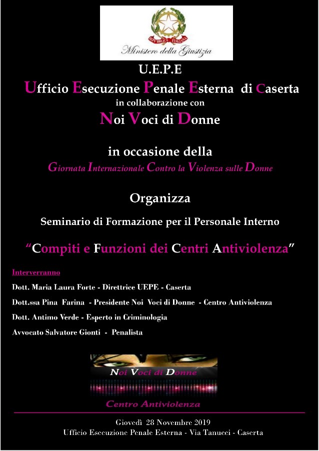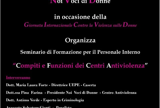 CASERTA – Giovedì 28 novembre 2019, l’Associazione “Noi Voci di Donne” sarà presso l’Ufficio Esecuzione Penale Esterna in Via Tanucci a Caserta in occasione della Giornata Internazionale Contro la Violenza sulle Donne, per la collaborazione di un Seminario di Formazione rivolto al Personale Interno organizzato dall’ente.