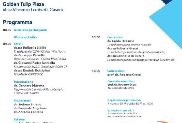 Un confronto interdisciplinare coordinato da Gennaro Musetta, responsabile del servizio di Radioterapia della clinica capuana, e curato dal comitato scientifico composto insieme al prof. Roberto Grassi, che vedrà protagonisti diversi esperti discutere ed analizzare le più moderne tecniche di intervento in casi di tumori alla prostata e le terapie più innovative. Ad aprire i lavori, a partire dalle ore 9,30, saranno i saluti di Raffaella Sibillo, presidente del CdA di Clinica Villa Fiorita, di Giuseppe Perrella, direttore Sanitario della casa di cura di Capua, di Giovanni Pietro Ianniello, responsabile U.O.C. Oncologia dell’azienda ospedaliera di rilievo nazionale e di alta specializzazione “Sant’Anna e San Sebastiano” di Caserta”, e di Erminia Bottiglieri, presidente dell’ordine dei medici di Caserta.