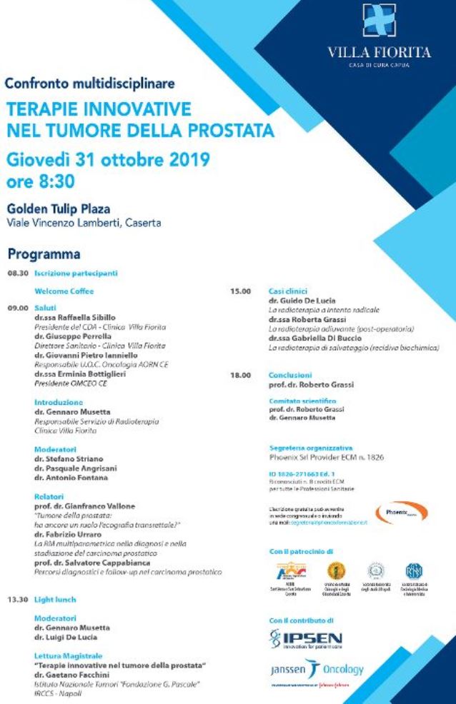 CASERTA – Terapie innovative nel tumore della prostata è il tema del convegno medico-scientifico promosso dalla Casa di Cura “Villa Fiorita” di Capua ed in programma domani, giovedì 31 ottobre 2019, presso il Golden Tulip Plaza di Caserta, con il patrocinio dell’Ordine dei Medici Chirurghi e degli Odontoiatri di Terra di Lavoro, AORN. Sant’Anna e San Sebastiano di Caserta, della Società Italiana di Radiologia Medica e Interventista e della Seconda Università degli studi di Napoli.