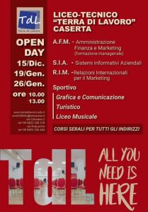 Qualsiasi indirizzo – sottolinea la Preside Nocerino – consente l’accesso a tutte le facoltà universitarie e molteplici sono gli sbocchi nel mondo del lavoro e lo slogan coniato dagli studenti dell’indirizzo grafica e comunicazione, “All you need is here” (Tutto ciò che serve è qui), è la perfetta sintesi. Il Liceo – Tecnico Terra di Lavoro, per il prossimo anno scolastico offre diverse proposte formative, ovvero: Amministrazione Finanza e Marketing, Indirizzo Sportivo, Grafica e Comunicazione, Indirizzo Turistico, Sistemi Informativi Aziendali e Liceo Musicale e Corsi Serali, infatti il Liceo – Tecnico vanta un’offerta formativa moderna e di elevate qualità, capace di preparare agli studi universitari o favorire l’immediato inserimento nel mondo del lavoro.