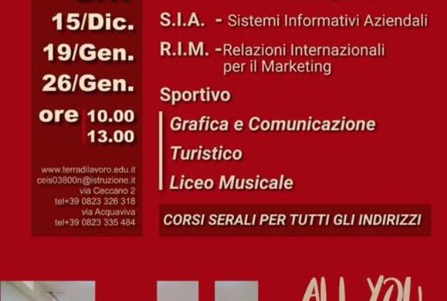 Il Liceo – Tecnico Terra di Lavoro, per il prossimo anno scolastico offre diverse proposte formative, ovvero: Amministrazione Finanza e Marketing, Indirizzo Sportivo, Grafica e Comunicazione, Indirizzo Turistico, Sistemi Informativi Aziendali e Liceo Musicale e Corsi Serali