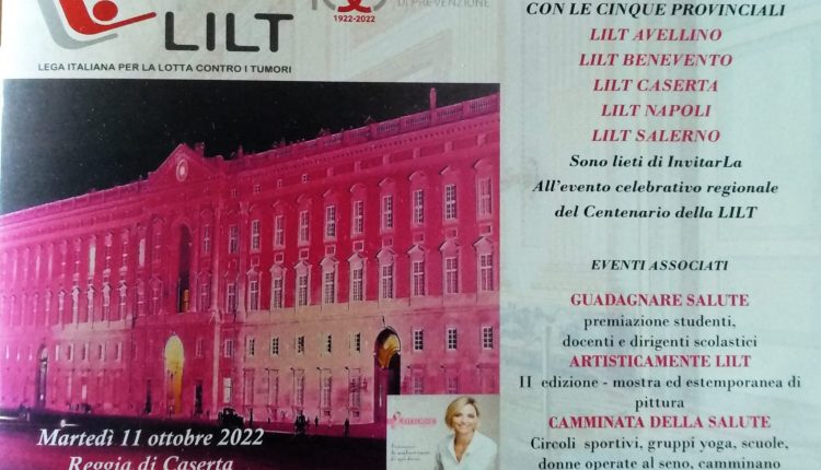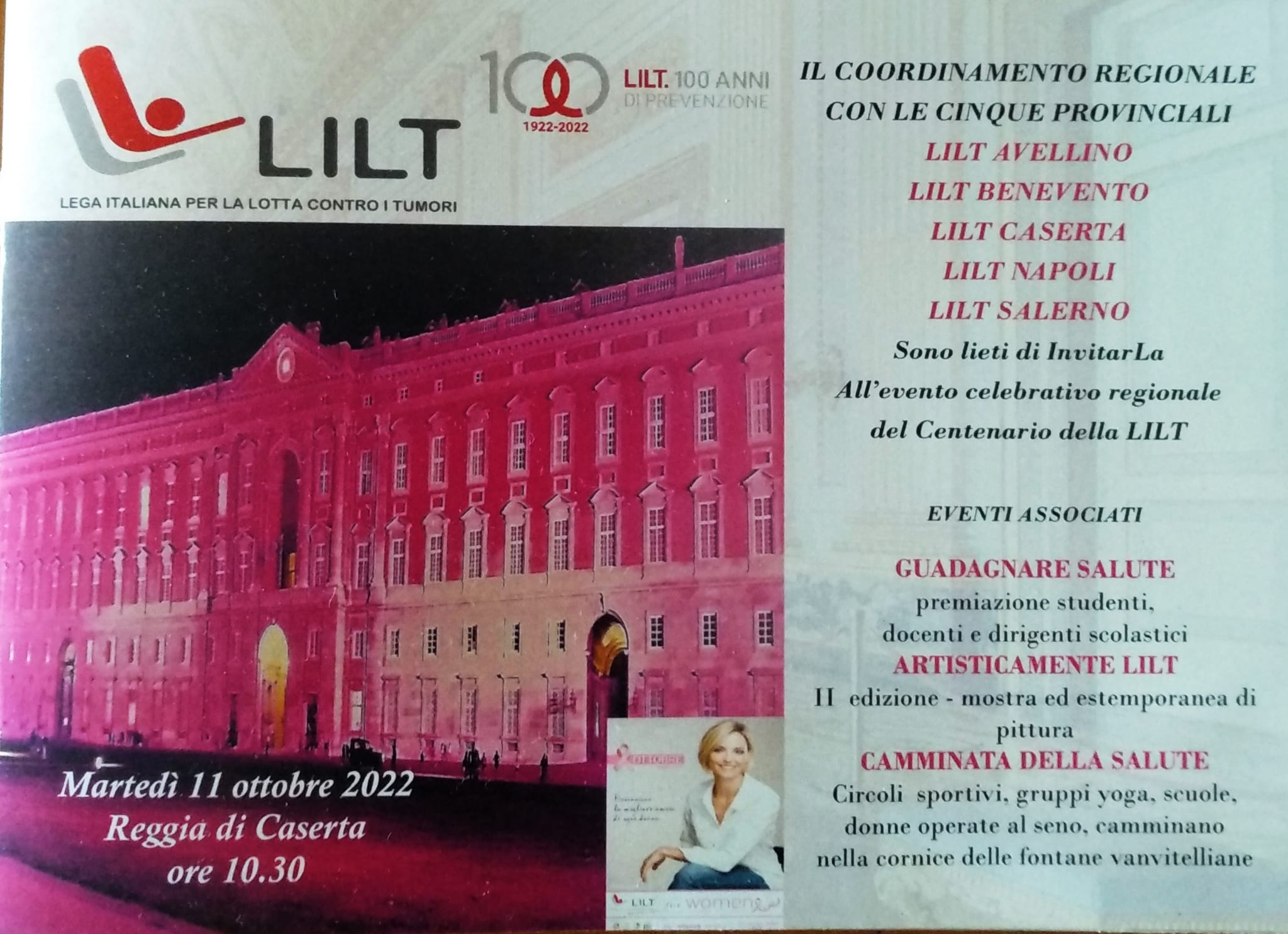 Questo il coordinamento regionale con le cinque provinciali: LILT Avellino, LILT Benevento, LILT Caserta, LILT Napoli , LILT Salerno. Questi invece gli Eventi associati alla manifestazione: GUADAGNARE BENE – premiazione studenti , docenti e dirigenti scolastici- ARTISTICAMENTE LILT -II Edizione mostra ed estemporanea di pittura- CAMMINATA DELLA SALUTE- Circoli sportivi, gruppi yoga, scuole, donne operate al seno camminano nella cornice delle fontane vanvitelliane.