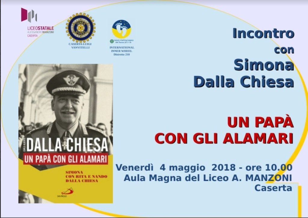 CASERTA – Il liceo Manzoni di Caserta e la Inner Wheel “Caserta Luigi Vanvitelli” hanno organizzato per venerdì 4 maggio 2018 alle ore 10.00 la presentazione del libro “Un papà con gli alamari”. Un libro scritto da Simona, Rita e Nando dalla Chiesa per raccontare la figura del padre Carlo Alberto, Generale e Prefetto italiano morto in un attentato mafioso a Palermo insieme alla moglie e l’agente di scorta Domenico Russo. Sarà proprio la figlia Simona dalla Chiesa ad incontrare in esclusiva gli studenti del Manzoni in aula magna e a presentare quello che in prefazione è definito non come una biografia del Generale, ma come “un toccante viaggio di famiglia, guidato dai suoi figli che, aprendo le stanze dei ricordi, regalano il ritratto privato di un papà e, insieme, di un eroe”. L’evento, che è sostenuto dalla Dirigente Scolastica Adele Vairo e dalla Presidente della Inner Wheel Maria Rosaria Pizzo Formichella, ha l’obiettivo di sensibilizzare i giovani sulla legalità e sull’importanza storica che hanno avuto alcuni personaggi nella lotta al terrorismo ed alla mafia in Italia.