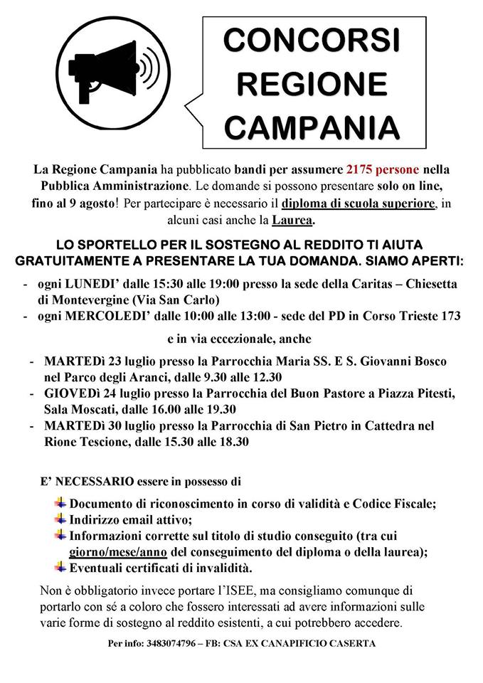 Caserrta-  Per quello che sarà ilprossimo concorso alla Regione Campania ci sta uno sportello a supporto per coloro che volessero o avessero intenzione di compliare ladomandao che non riescono a scriverla  per un qualsivoglia motivo. Ecco giorni e orari di sotto.