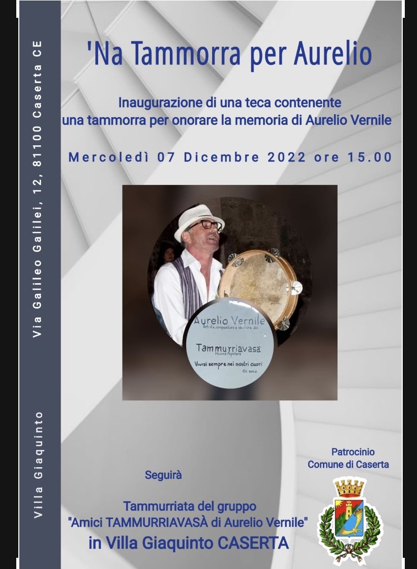 L’istallazione della Teca è prevista, alla presenza del Sindaco Carlo Marino, per mercoledì 7 dicembre 2022 alle ore 15 in Villa Giaquinto sita in via Galilei a Caserta. Nel corso della manifestazione ci sarà una tammurriata in onore di Aurelio.