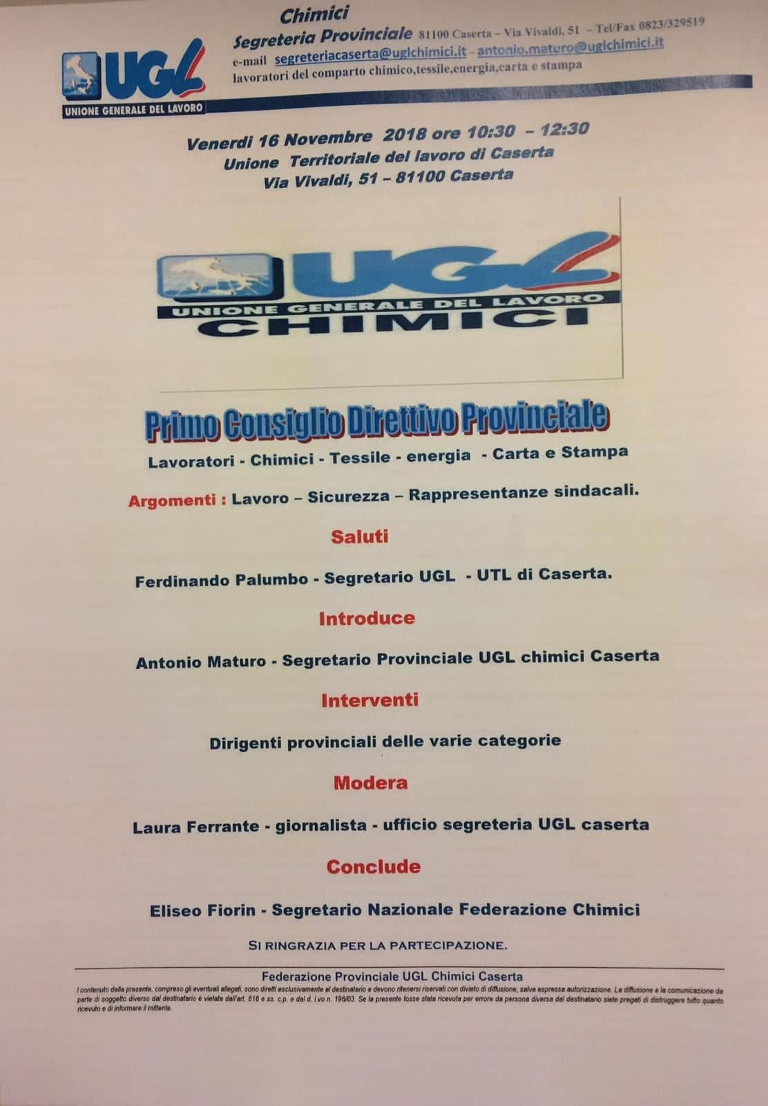 Venerdì 16 novembre Primo Consiglio UGL Chimici in Via Vivaldi. Maturi, “motivo di orgoglio”