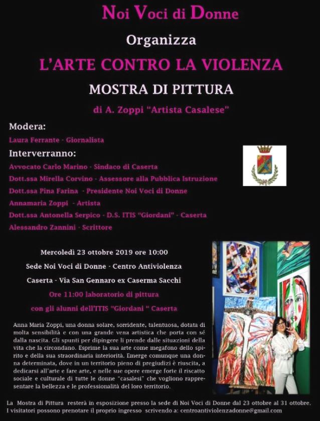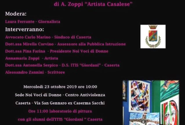 CASERTA – Il Centro Antiviolenza “Noi Voci di Donne”, con sede presso l’ex Caserma Sacchi in Via San Gennaro a Caserta, organizza la mostra di pittura “L’ARTE CONTRO LA VIOLENZA” di Anna Maria ZOPPI, artista casalese. Il vernissage è previsto per il 23 ottobre 2019, con inizio alle ore 10:00 e resterà aperto al pubblico al 31 ottobre 2019.