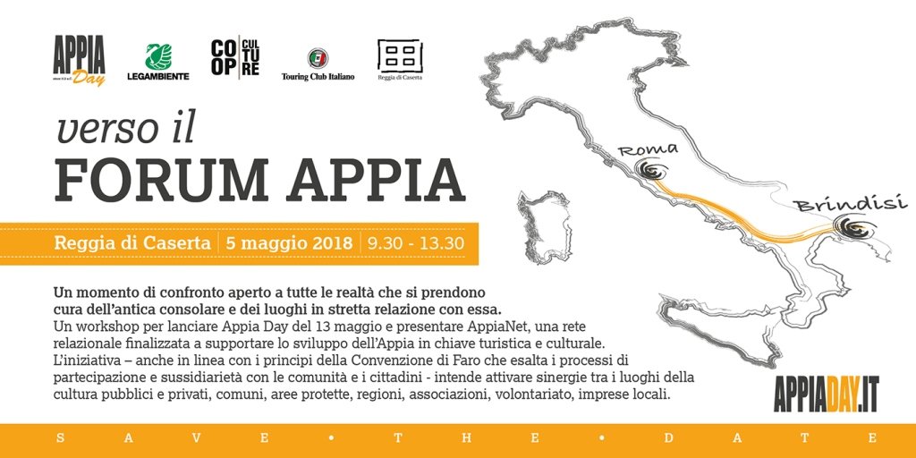 CASERTA – Sabato 5 maggio 2018, dalle 9.30 alle 13.30 alla Reggia di Caserta, si terrà l’incontro “Verso il Forum Appia” organizzato da Legambiente, Touring Club Italiano e CoopCulture. Un momento di confronto aperto a tutte le realtà che si prendono cura dell’antica consolare e dei luoghi che sono in stretta relazione con essa che vuole sia presentare gli appuntamenti di Appia Day del 13 maggio 2018 tra Roma e Brindisi sia ragionare di AppiaNet, una rete “relazionale” finalizzata a supportare lo sviluppo dell’Appia in chiave turistica e culturale. La partecipazione a Verso il Forum Appia è gratuita. È gradita la prenotazione scrivendo a m.laurenti@legambiente.it. Il 13 maggio 2018 torna l’Appia Day, il festival diffuso della regina viarum, con l’apertura straordinaria e gratuita dei monumenti tra Roma e Brindisi e tanti eventi – passeggiate, trekking, ciclotour, musica e spettacoli – per vivere l’archeologia e il territorio a piedi e in bici. Un’occasione per celebrare il fascino e l’incanto dell’Appia Antica, per scoprire quello storico e originale modello di collegamento viario capace di unire Roma e territori lontani e che oggi può diventare la via privilegiata per un’azione di trasformazione della città, per l’affermazione di una nuova idea di uso del territorio e dei beni comuni. L’Appia Day, che lo scorso anno ha visto la partecipazione di oltre 50mila persone, sarà riservata esclusivamente a pedoni e pedali, con monumenti aperti gratuitamente e pronti a svelare la loro bellezza e i loro segreti, visite guidate per accompagnare i visitatori alla scoperta delle storie millenarie del più suggestivo museo a cielo aperto del mondo. E poi trekking, archeotour in bici, walkabout, street food, musica, attività per bambini. Anche per questa edizione 2018 saranno tanti gli eventi organizzati soprattutto a Roma, cuore dell’Appia Day, ma anche nei diversi comuni del centro e sud Italia attraversati dall’antica Appia.