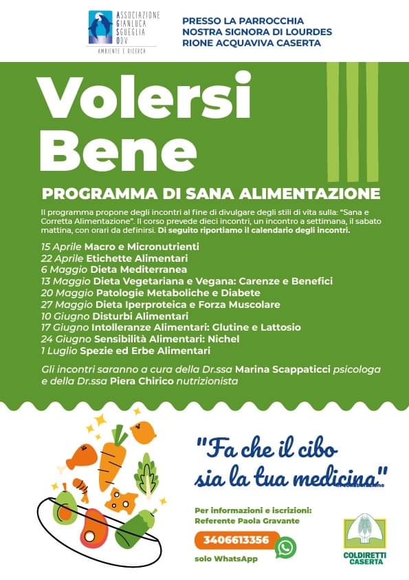 Caserta – Sana Alimentazione è il tema introdotto dallo slogan “Fai che il cibo sia la tua medicina” nell’ambito del programma “Volersi Bene”, promosso dall’associazione Gianluca Sgueglia ODV, per divulgare degli stili di vita sulla Sana e Corretta Alimentazione.