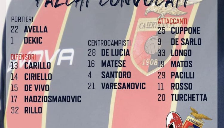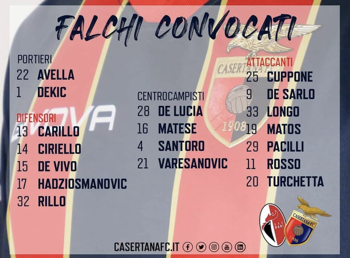Tanti problemi in casa casertana in vista della trasferta di domani pomeriggio in casa del Bari, già di suo la squadra pugliese è una delle corazzate del campionato, se però ci metti anche le assenze dei falchetti tra squalifiche ed infortuni la trasferta diventa quasi proibitiva. I pugliesi arrivano a questa gara dopo la sconfitta contro la Ternana e quindi avranno voglia di riscattarsi subito. Anche per i falchetti però ci sarà l’occasione di riscatto dopo la sconfitta di domenica contro il Bisceglie. Saranno 18 i calciatori convocati da mister Guidi, non saranno della gara gli infortunati Del Grosso, Castaldo, Izzillo, Icardi, Zivkovic, Bordin, Matarese e Konate. Ovviamente non saranno della gara anche Buschiazzo e Polito squalificati