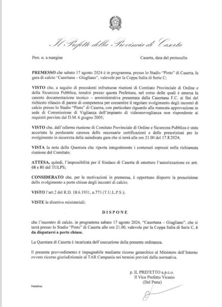 Come potete leggere nel decreto pubblicato, la motivazione ufficiale di questa scelta risiede nella carenza di documentazione tecnico-amministrativa presentata dalla società sportiva. Tale carenza ha impedito al Comitato Provinciale di Ordine e Sicurezza Pubblica di rilasciare l’autorizzazione necessaria per consentire l’accesso del pubblico allo stadio.