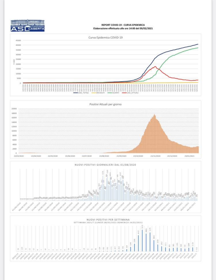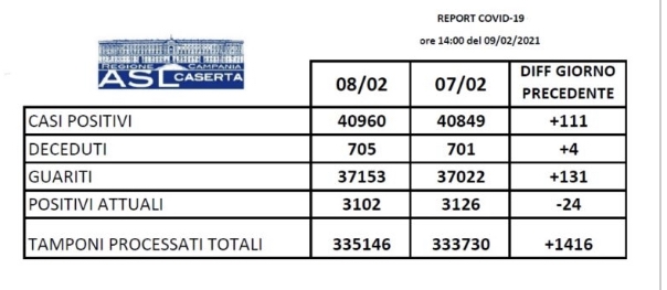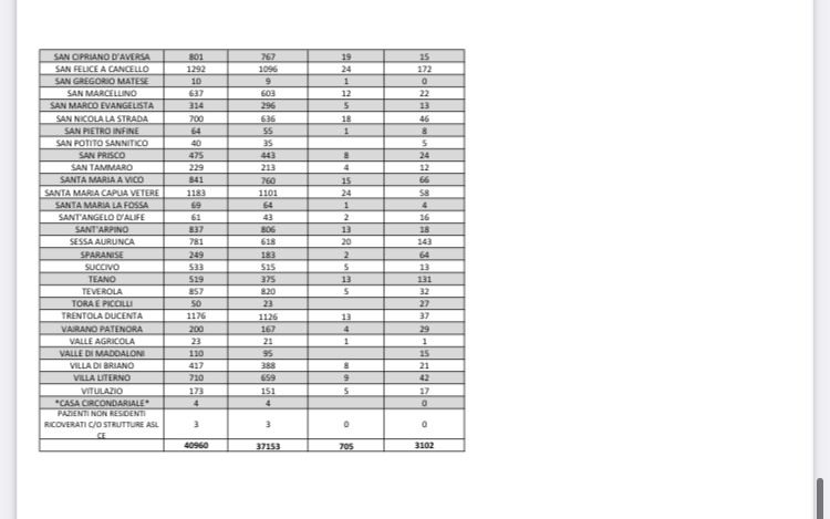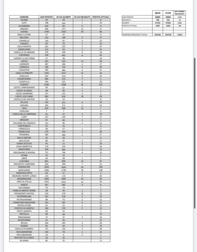 Sono 3102 gli attuali positivi (-24 rispetto al giorno 8), 131 i guariti e 4 i decessi a Frignano, Cellole, Giano Vetusto e Mondragone