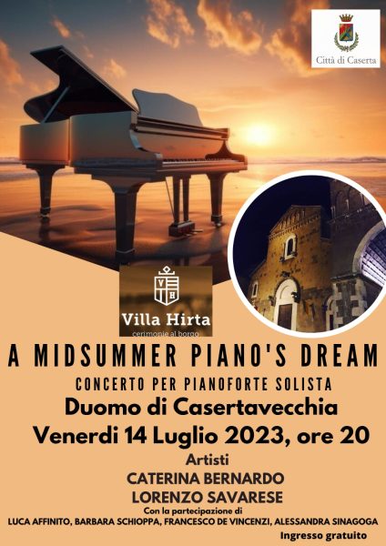 Il pianoforte è quello strumento che ha cambiato la scena musicale dal ‘700 in poi, divenendo quel portale tra la realtà e la dimensione dell’anima, tra la realtà e un sogno capace di ristorare ogni anima; e sarà proprio lui, nella calda stagione che ci avvolge, il protagonista dell’evento “A Midsummer Piano’s Dream”, Concerto per Pianoforte Solista, che si terrà Venerdì 14 luglio 2023 nella suggestiva location del Duomo di Casertavecchia e sarà condotto dal Direttore Artistico Caterina Bernardo: il repertorio sarà prevalentemente classico, tra autori quali Chopin, Beethoven, Debussy, insieme al pianista Lorenzo Savarese; parteciperanno anche giovani talenti del territorio che sempre vengono coinvolti al fine di stimolare nelle nuove generazioni l’amore per lo studio della musica.